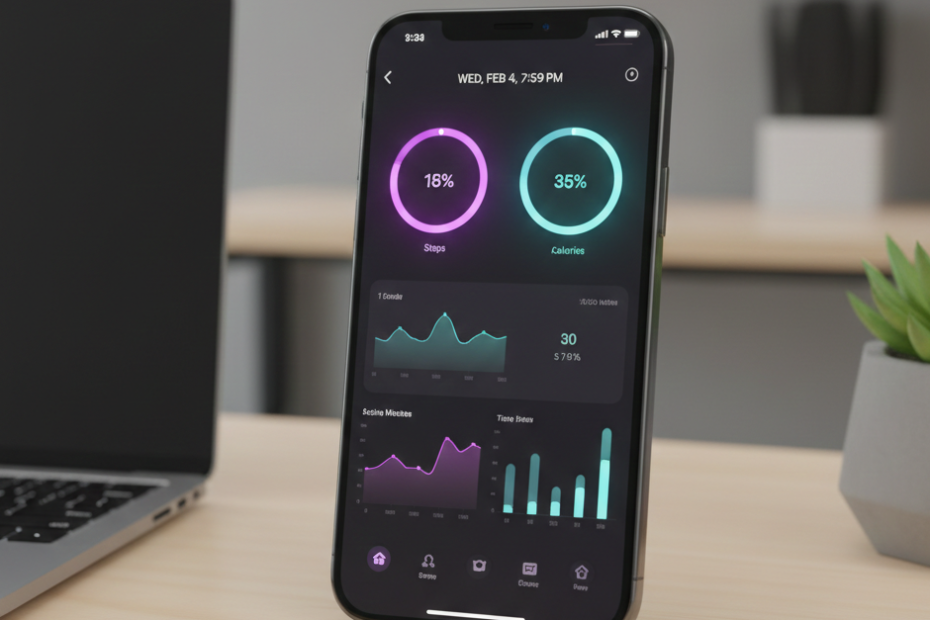 • Kluczowe funkcje: Wykorzystaliśmy neonowy interfejs w trybie Dark Mode, aby zapewnić czytelność wykresów aktywności i spalonych kalorii nawet przy intensywnym świetle. Aplikacja płynnie integruje się z systemowymi funkcjami monitorowania zdrowia.